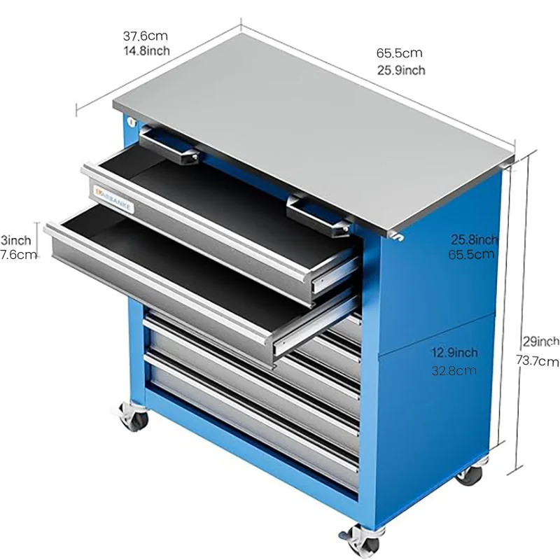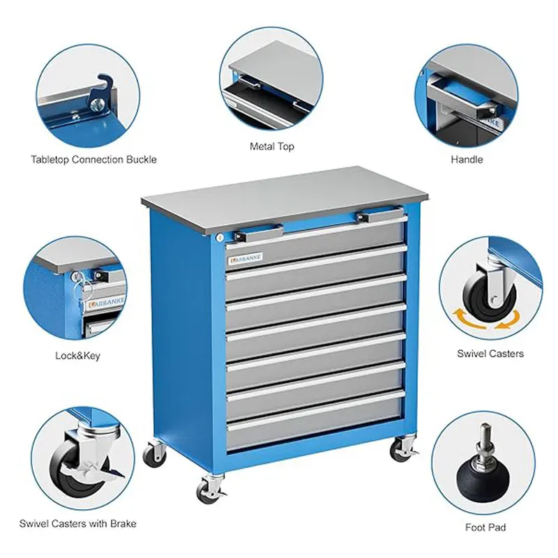 El carro organizador de herramientas AIRAJ con 7 cajones metálicos está diseñado para talleres, garajes y mecánicos que necesitan una solución robusta y práctica para almacenar herramientas. Fabricado en acero sólido de alta resistencia y con recubrimiento de pintura electrostática, ofrece máxima durabilidad, resistencia al óxido y un acabado elegante en color azul y negro.